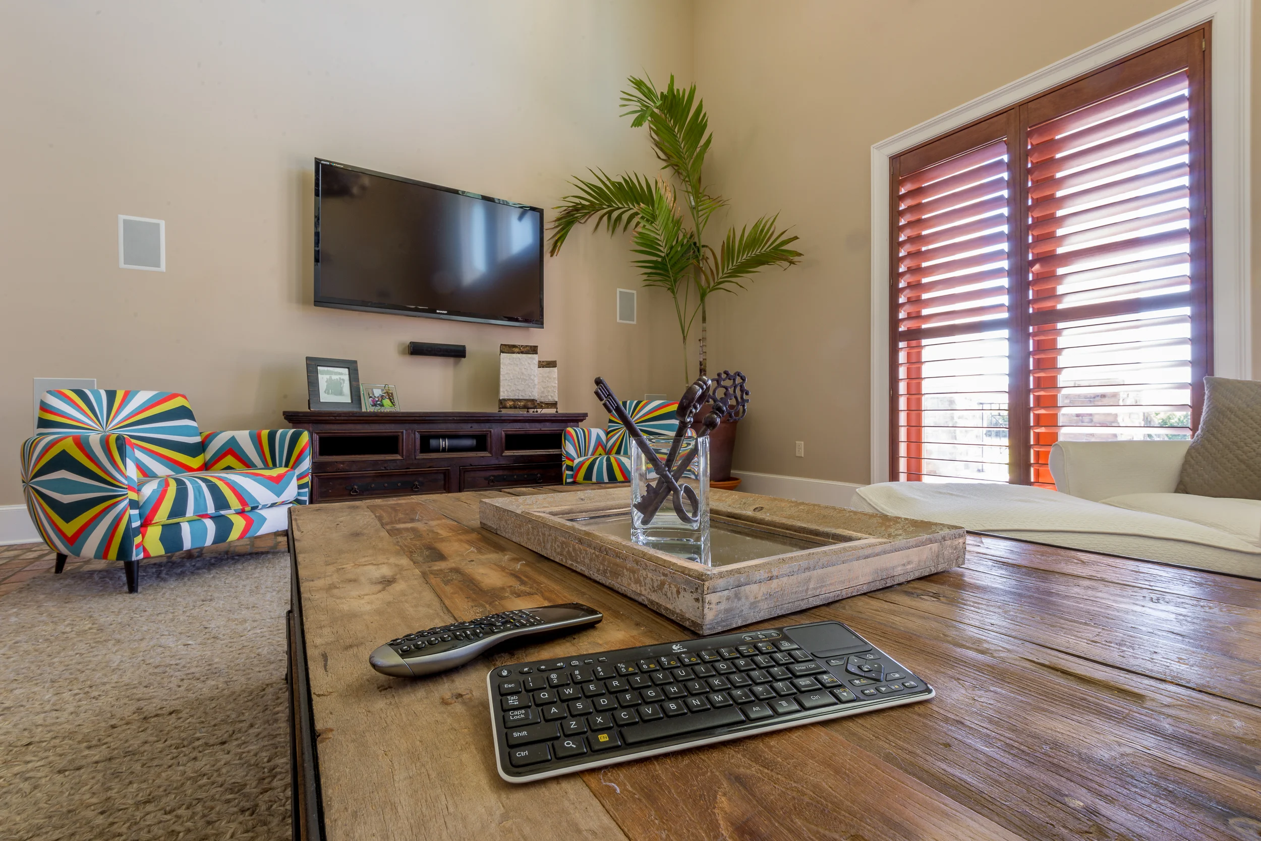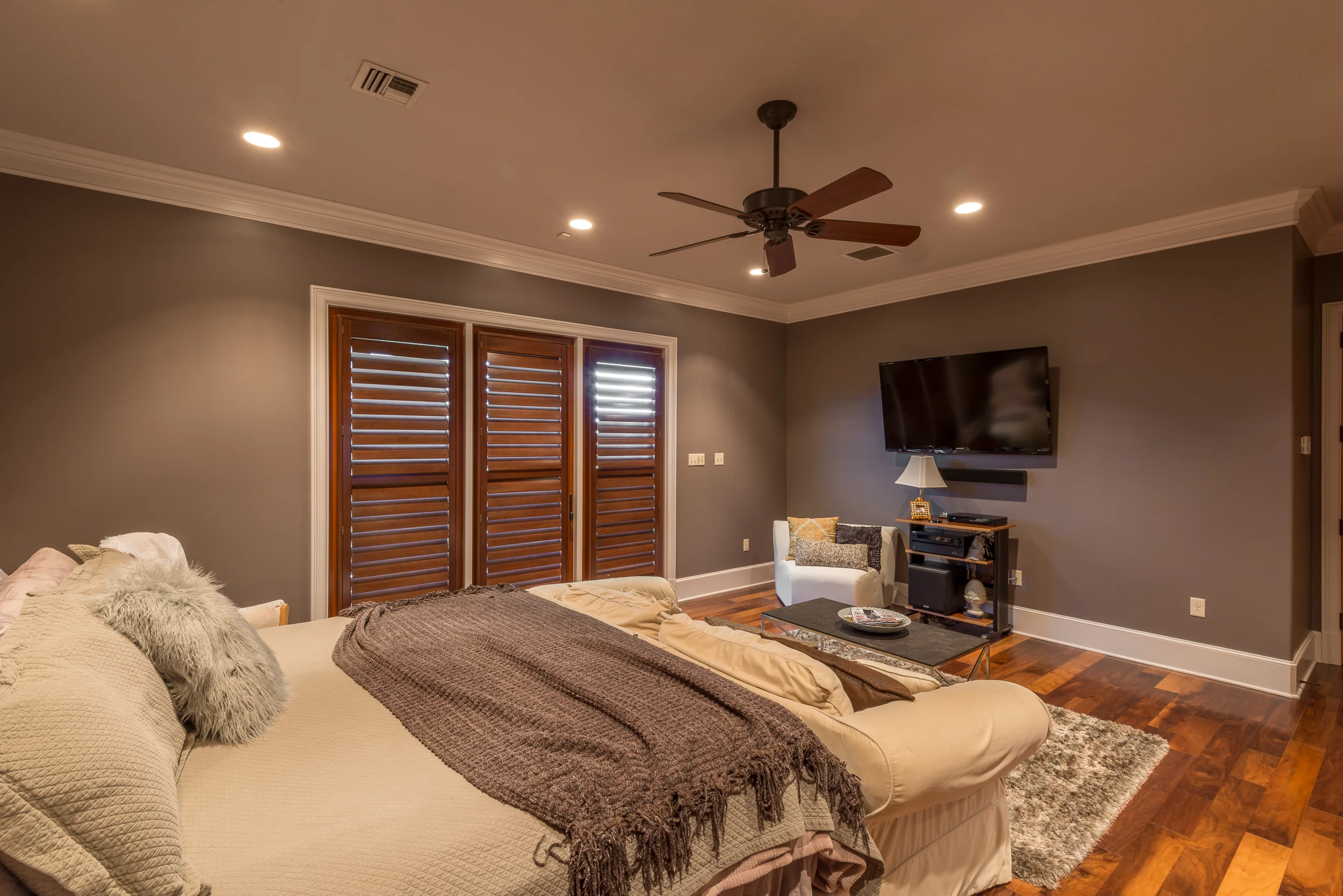 A Panasonic 46" full-array LED TV and a Pinnacle Wafer Series sound bar provide excellent sound and vision for this Houma residence. The cabinet houses the home's dual zone sound system and powerful Velodyne subwoofer for theater-like sound.