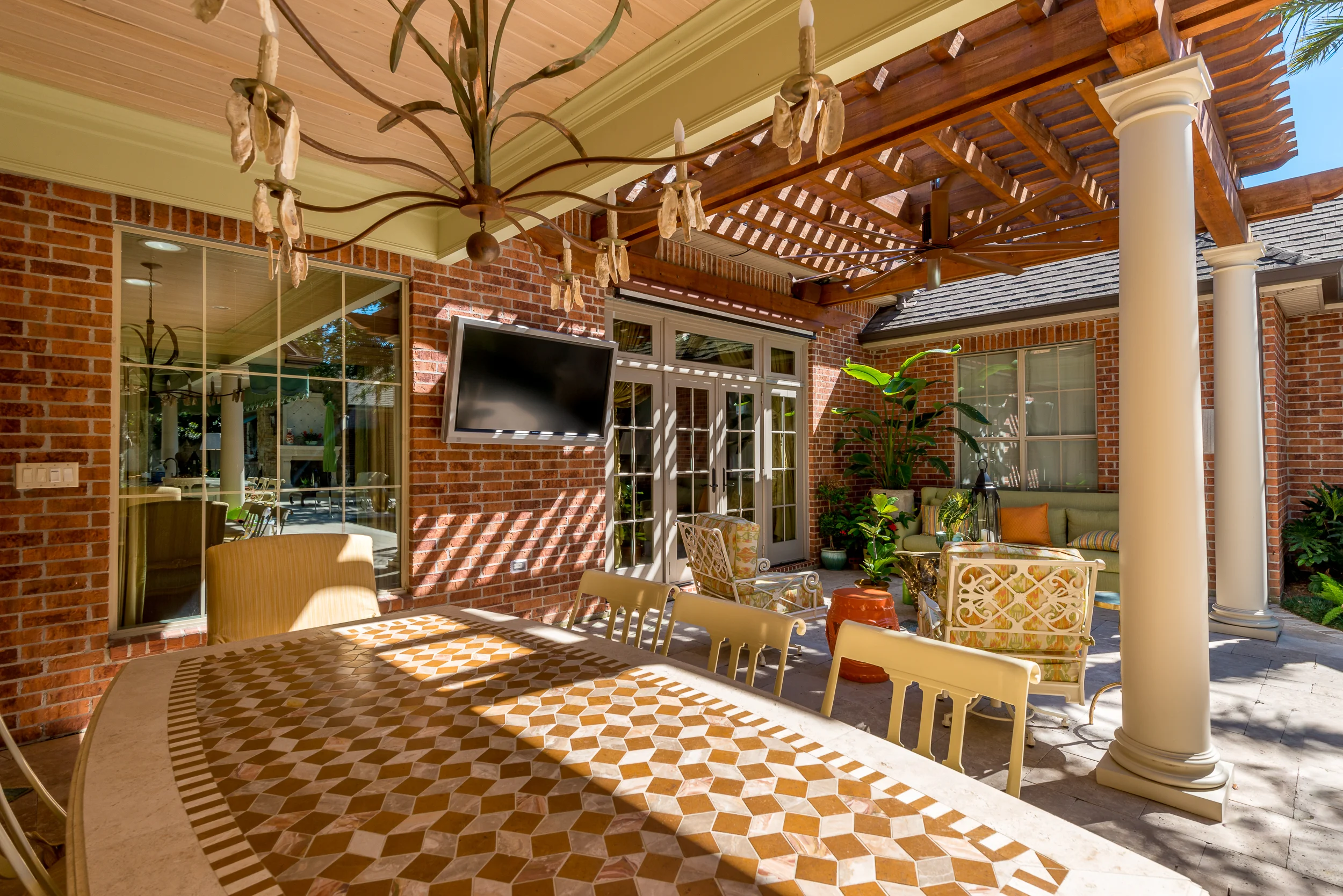 This backyard oasis is tricked out with sound and vision. Two SunBrite displays (55" and 46") along "speakers everywhere" make this true outdoor system rock!